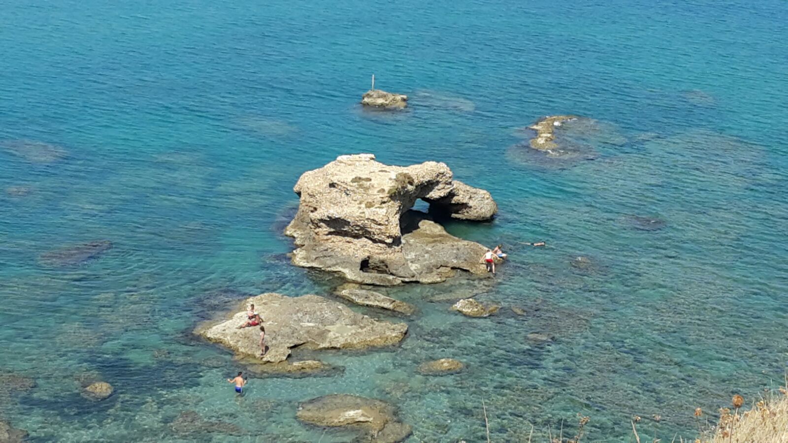 Arrivati alla spiaggia cerchiamo un posto per posizionare i nostri ombrelloni troviamo anche un tavolo fatto al naturale dove ci appoggiamo le nostre cose. È un vero paradiso inizialmente il tempo coperto non rendeva i colori di questo paesaggio poi con il sole tutto è cambiato. Iniziamo le nostre esplorazione ma la tentazione di un bel bagno non ci fa attendere e subito una bella nuotata fino sotto il trabucco.