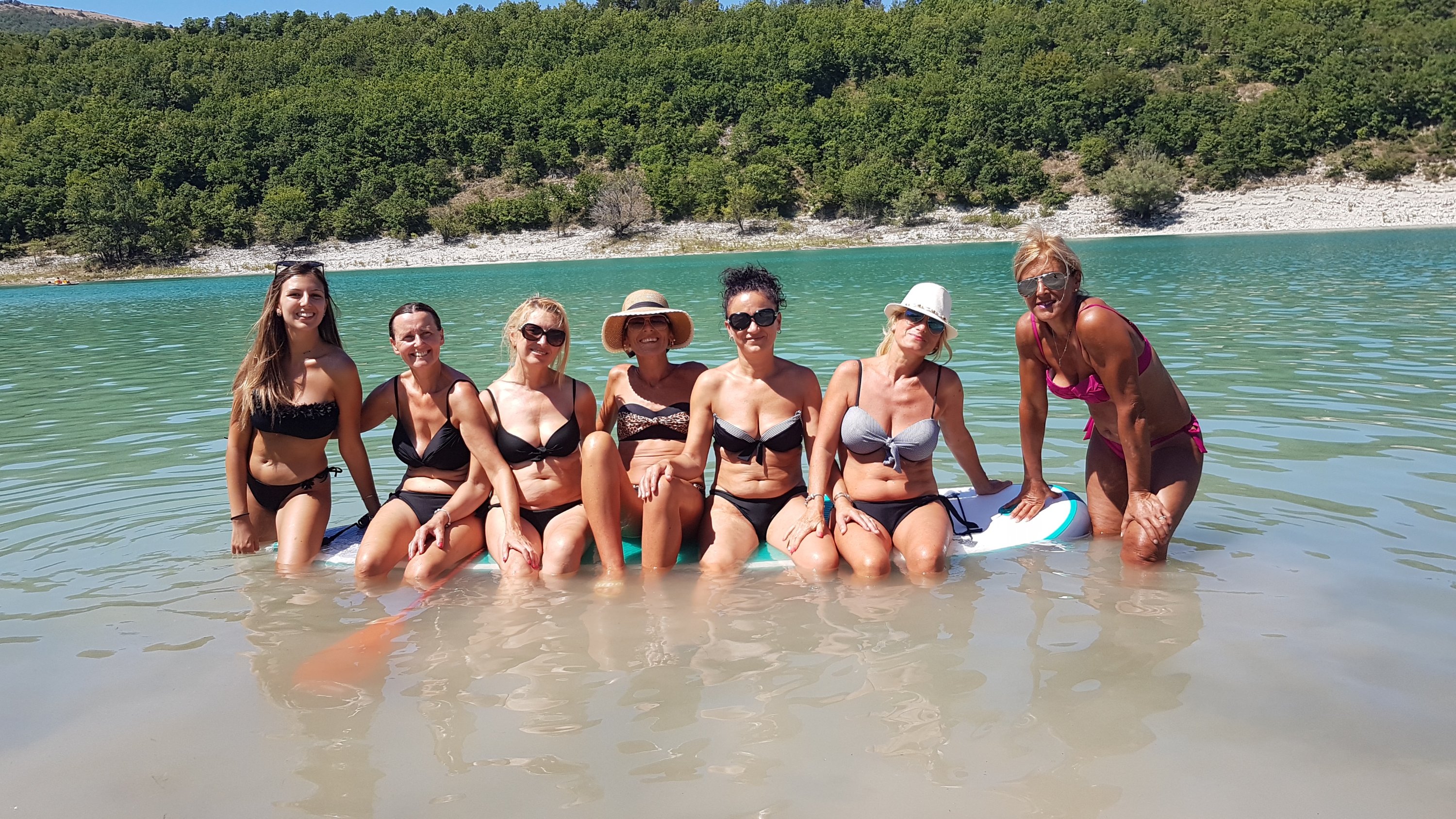Una volta accampati con tutte le borse tavolini cocomero 20 kg immerso nelle acque per tenerlo fresco ci siamo buttati tutti in acqua con il sup che era diventata il set fotografico del gruppo vacanze.