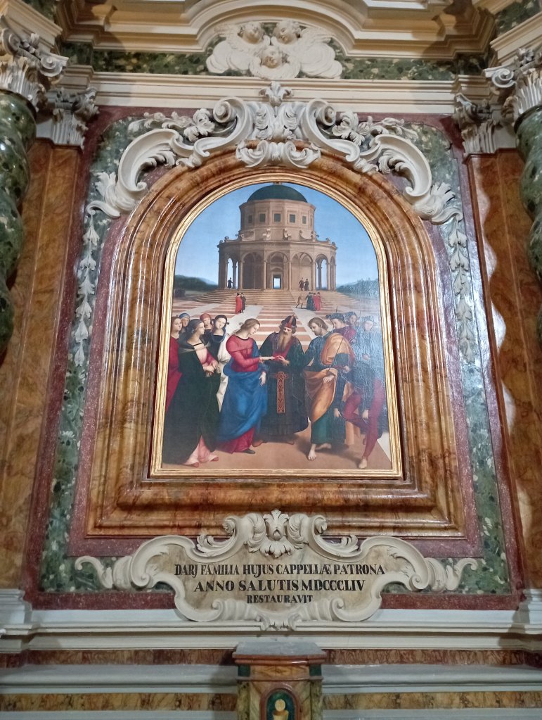 Il primo risultato della ricerca mi dà Sposalizio della Vergine dipinto a Olio di Raffaello Sanzio 1504 conservato presso la pinacoteca di Brera a Milano fonte Wikipedia.
