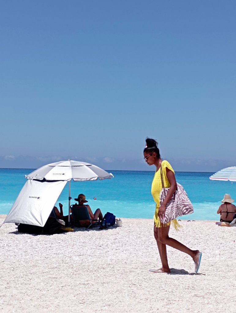 Dal nostro hotel sono circa 45 minuti di auto praticamente si taglia l’isola in un paesaggio mozzafiato in alcuni tratti sembra di vedere alcuni scorci della Toscana in quanto ci sono le strade con tutti i cipressi.Le indicazioni stradali sono molto scarse quindi consiglio la guida con Maps. appena si scende per raggiungere la spiaggia veniamo catturati dalla bellezza dei colori che la circondano. lo stabilimento che prendiamo è Antisamos Beach Bar che per la modica cifra di 37 euro prendiamo un ombrellone e 2 lettini e 2 yogurt con frutta tutta di loro produzione anche il miele che in quest’isola ne abbonda.