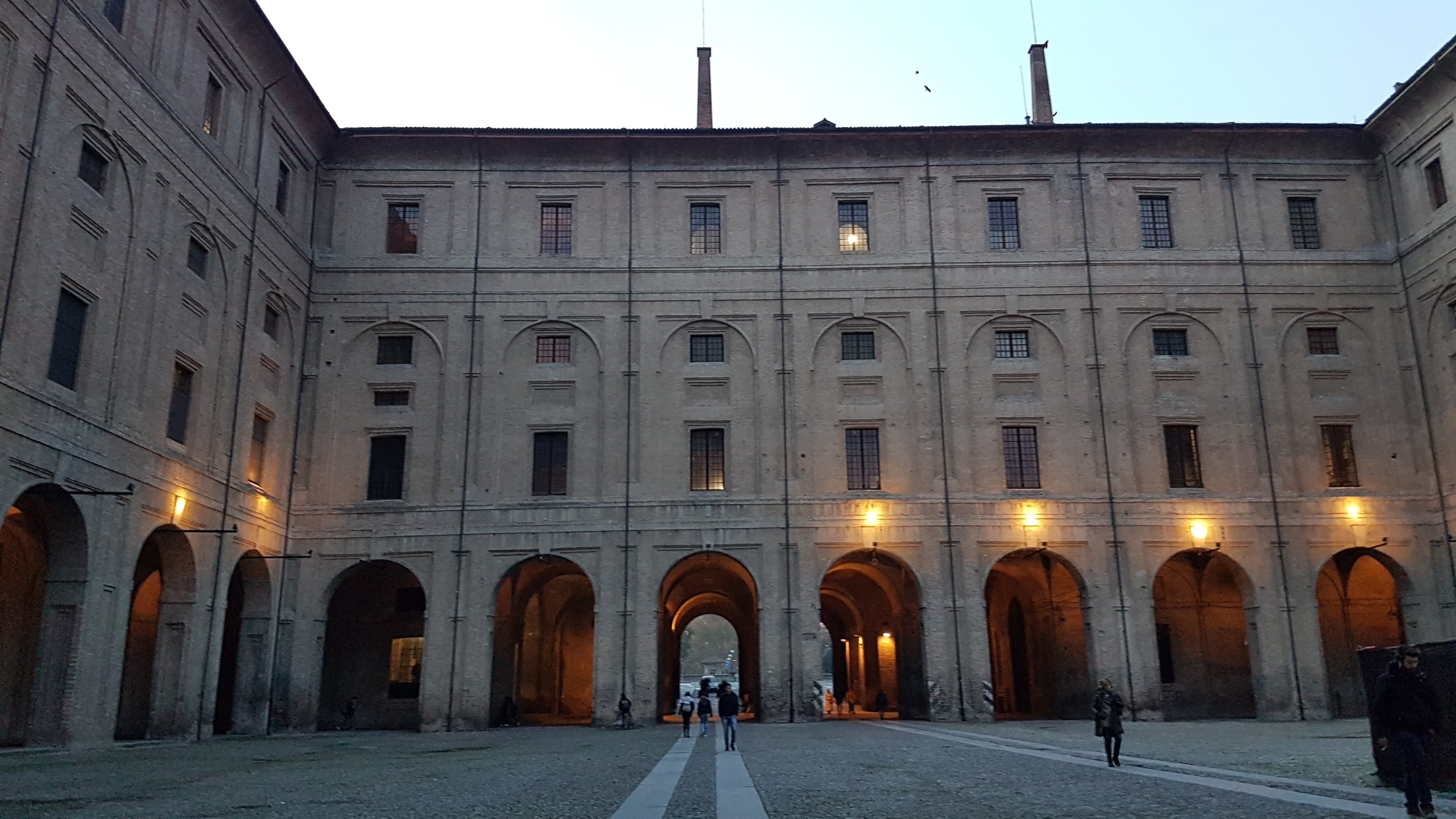 Con la bici passo proprio sotto il Palazzo Pilotta Un impressionante complesso monumentale che mi ha colpito nella sua architettura, così sobria, robusta ed elegante.