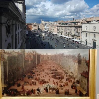 Voglio mettere subito al risalto la mia foto fatta oggi e il quadro che è all’interno della mostra raffigurante la piazza Navona nel 1634.