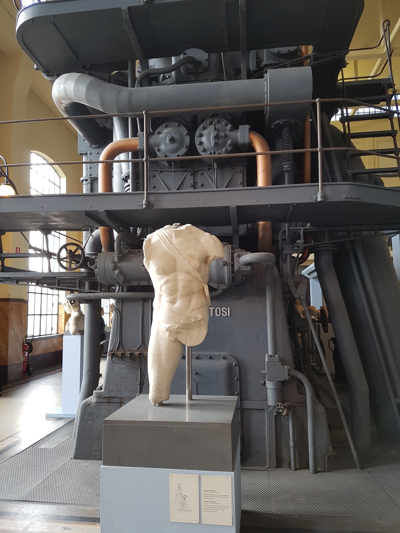 Accanto hai vecchi macchinari si sbagliano capolavori di scultura antica e preziosi manufatti provenienti dagli scavi di Roma.